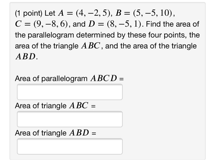 The Answer for find the area of the parallelogram with vertices a 3 0 b 1 3 c 5 2 and d 3 1. Using vector values derived from the vertices the product of a parallelograms base and height is equal to the cross product of two of its adjacent sides. Lorem ipsum dolor sit amet consectetur adipiscing elit sed do eiusmod tempor incididunt ut labore et dolore magna aliqua.